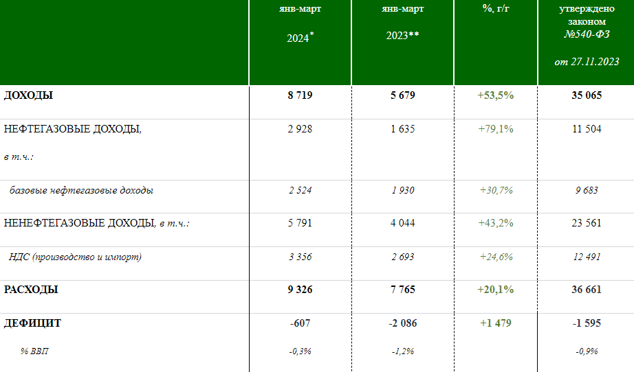 В оценке бюджета за первые два месяца дефицит бюджета составлял 1,5 трлн руб (план на год 1,6 трлн руб). Сейчас дефицит снизился в 2,5 раза за счёт профицитного месяца.