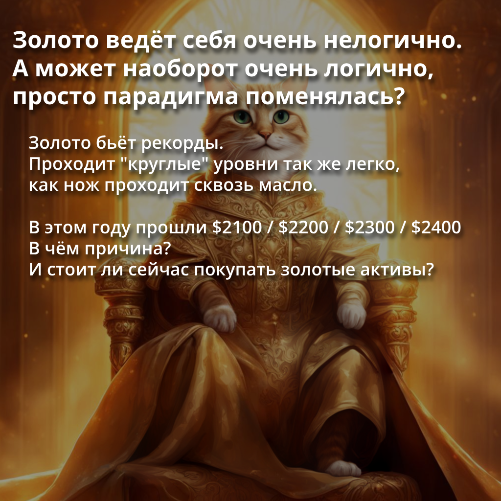 В этом году прошли $2100 / $2200 / $2300 / $2400 за унцию и всё это за пару месяцев. С минимумов октября цена увеличилась почти на треть. Из них за последние 3 месяца рост составил более 15%.
