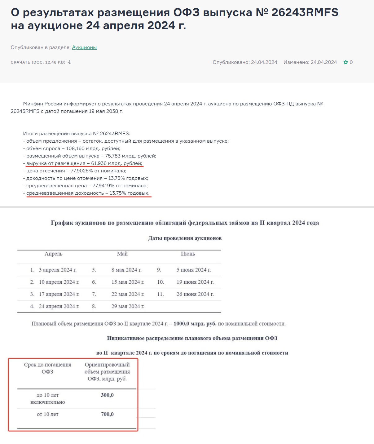 Сегодня Минфин наконец-то занял через выпуск "от 10 лет". Состоялся только один аукцион по размещению ОФЗ-ПД 26243 $SU26243RMFS4, заняли относительно не много 63,534 млрд руб. (рис 1)