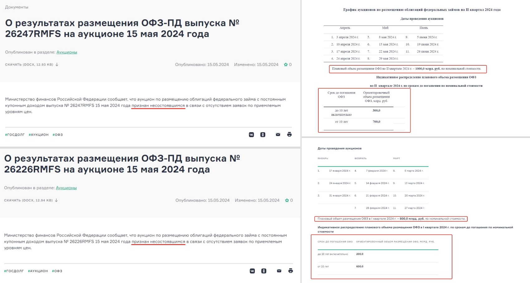 Случилось интересное. Сегодня отменились два аукциона Минфина «в связи с отсутствием заявок по приемлемым уровням цен». Должны были занимать через выпуски ОФЗ 26247 $SU26247RMFS5 и 26226 $SU26226RMFS9 (рис 1 и 2). Последний раз подобное было более полугода назад (в конце сентября 2023).