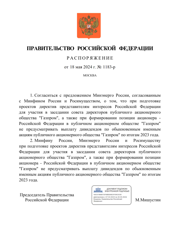 Правительство выпустило распоряжение, подготовить директиву об отказе выплачивать дивиденды «Газпром» за 2023