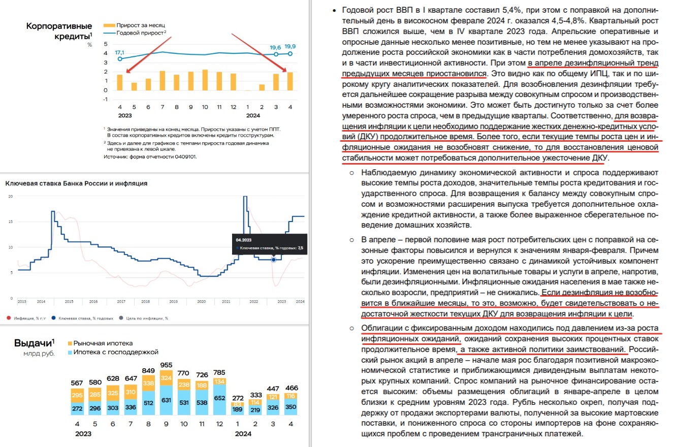 На фоне этих цифр интересно, что будет делать ЦБ. В этом нам поможет свежий обзор ЦБ "О чем говорят тренды". Он даёт нам набор рассматриваемых вариантов, ещё до того как их озвучит Эльвира Сахипзадовна 7 июня (рис 4)