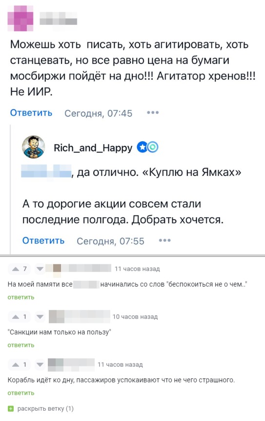 Иногда на рынке у части участников сдают нервы (рис 1), кажется что "Всё Пропало" для РФ вообще и для отдельных компаний в частности. Для примера пару комментариев к утреннему посту про МосБиржу на паре площадок.