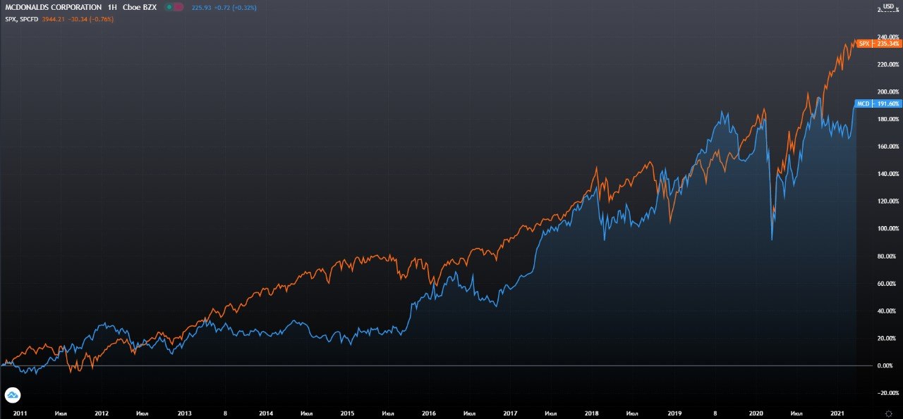 McDonald's $MCD - король фастфуда. Прибыль корпорации McDonald поступает от продаж в собственных ресторанах, а так же от арендной платы, которые платят франчайзи за аренду помещений у McDonald's. Конкурирует с такими компаниями как Starbucks $SBUX и Yum! $YUM