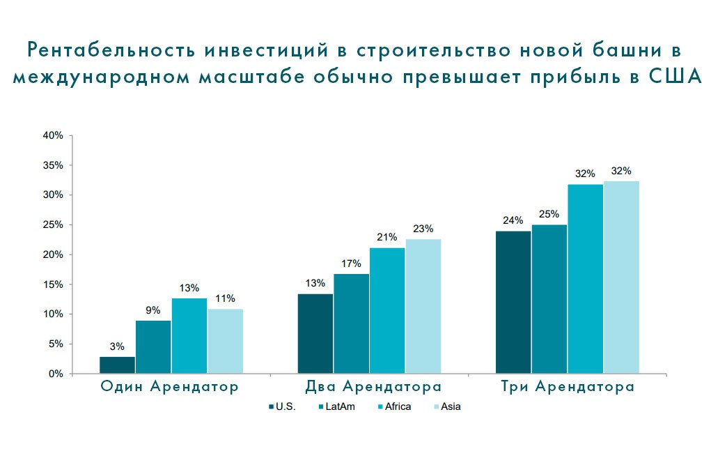 У American Tower значительные возможности на международных рынках, так как сети 3G и 4G далеко не повсеместны во многих регионах, существует множество значительных рынков, на которых проникновение подвижной широкополосной связи значительно ниже 100%, в основном в Азии, Латинской Америке и Африке. Это представляет собой отличную возможность роста.