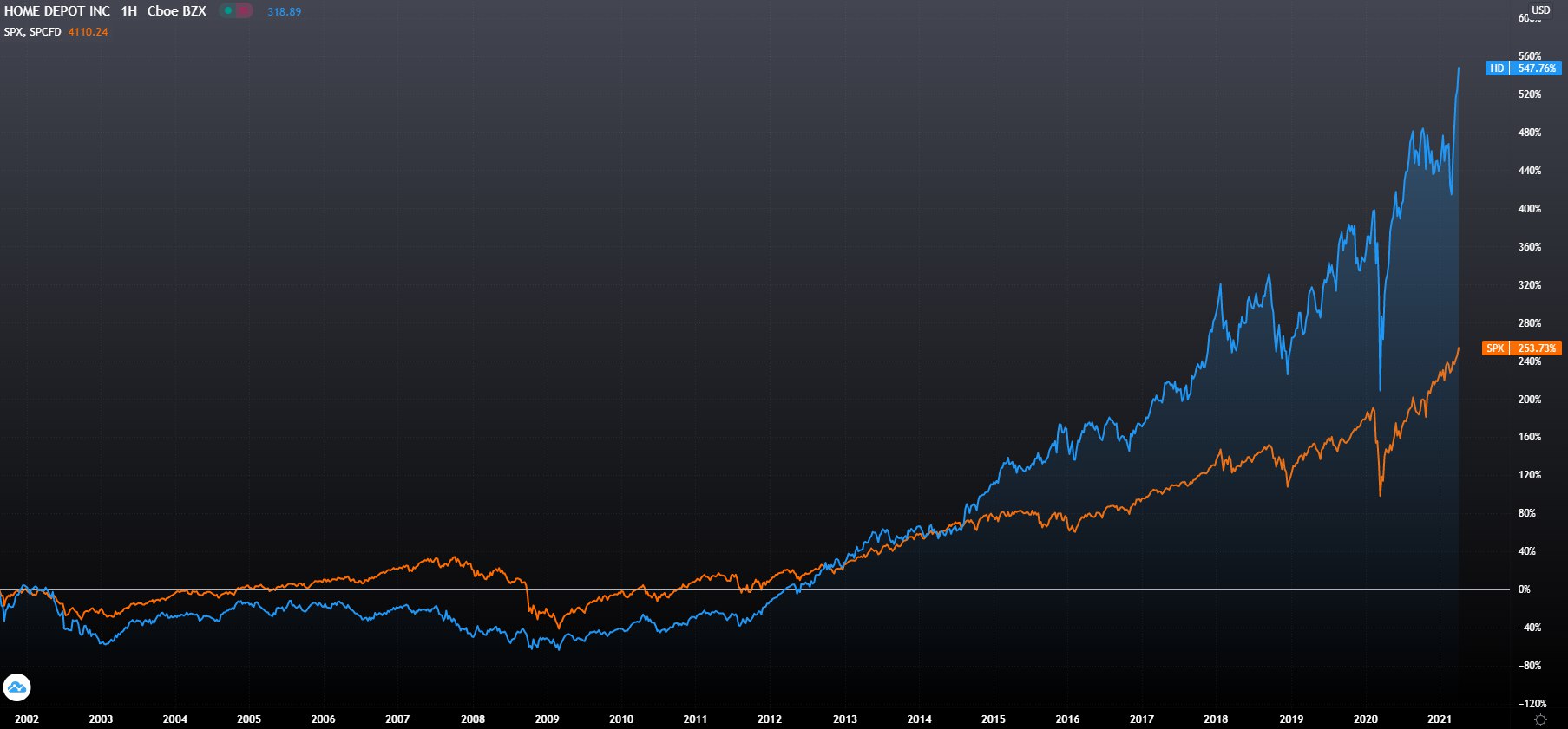 Стоимость акций HD растёт быстрей индекса S&P 500. Последние годы благодаря экономии на масштабе рост был быстрее, так как позвонил увеличить маржу. Теперь благодаря устойчивому конкурентному преимуществу (размеру компании и объёмам закупок) конкурентам достаточно тяжело будет забирать долю рынка