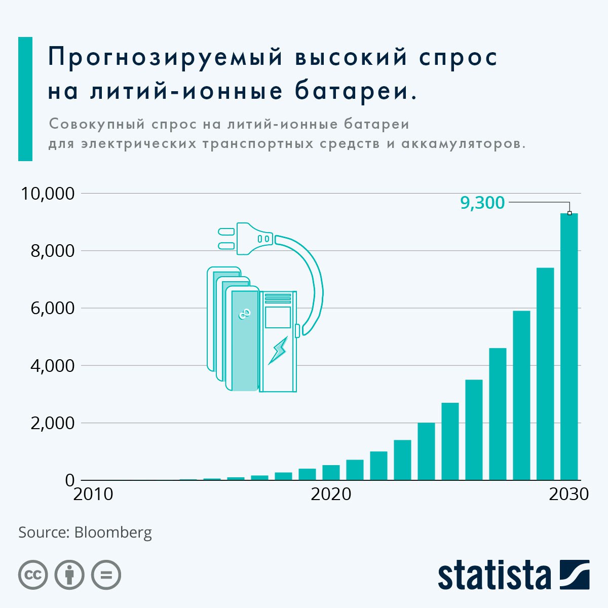 На графике ниже показано, как спрос на литий-ионную технологию в электромобилях и накопителях энергии начал быстро расти за последние 10 лет. Совокупный спрос, составлявший всего 0,5 гигаватт-часа в 2010 году, вырос примерно до 526 гигаватт-часов в 2020 году. Ожидается, что этот бурный рост будет продолжаться и далее.