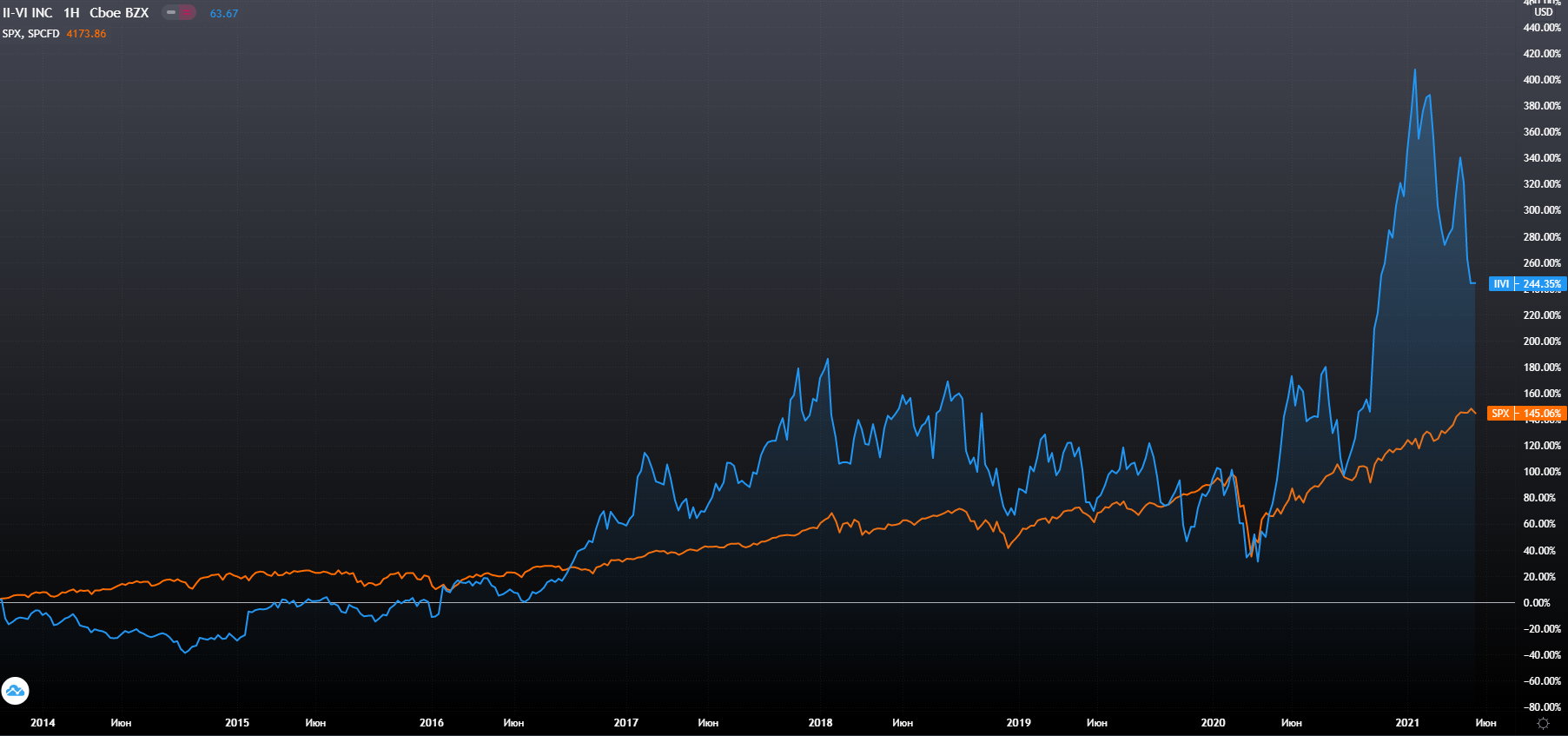 Компания растёт быстрее индекса S&P 500. Учитывая что II–VI работает не на одном, а сразу на нескольких долгосрочных растущих рынках: 5G, автономные транспортные средства, облачные вычисления, полупроводники. Это всё рынки с очень высокими темпами роста. Это всё сильный попутный ветер для компании