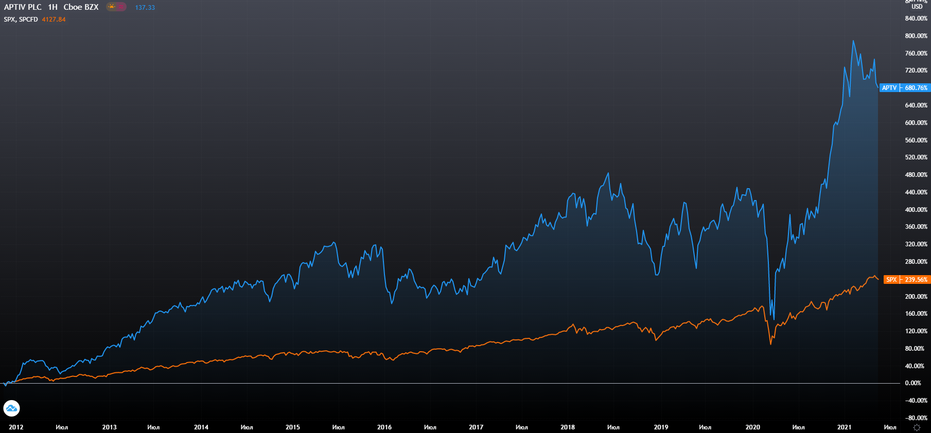 Aptiv растёт очень быстро обгоняя индекс S&P 500 почти в 3 раза. Не только основной бизнес растёт хорошими темпами, но и дополнительные возможности в Motional в партнёрстве с такими крупными компаниями, значительно увеличивают дальнейший потенциал роста