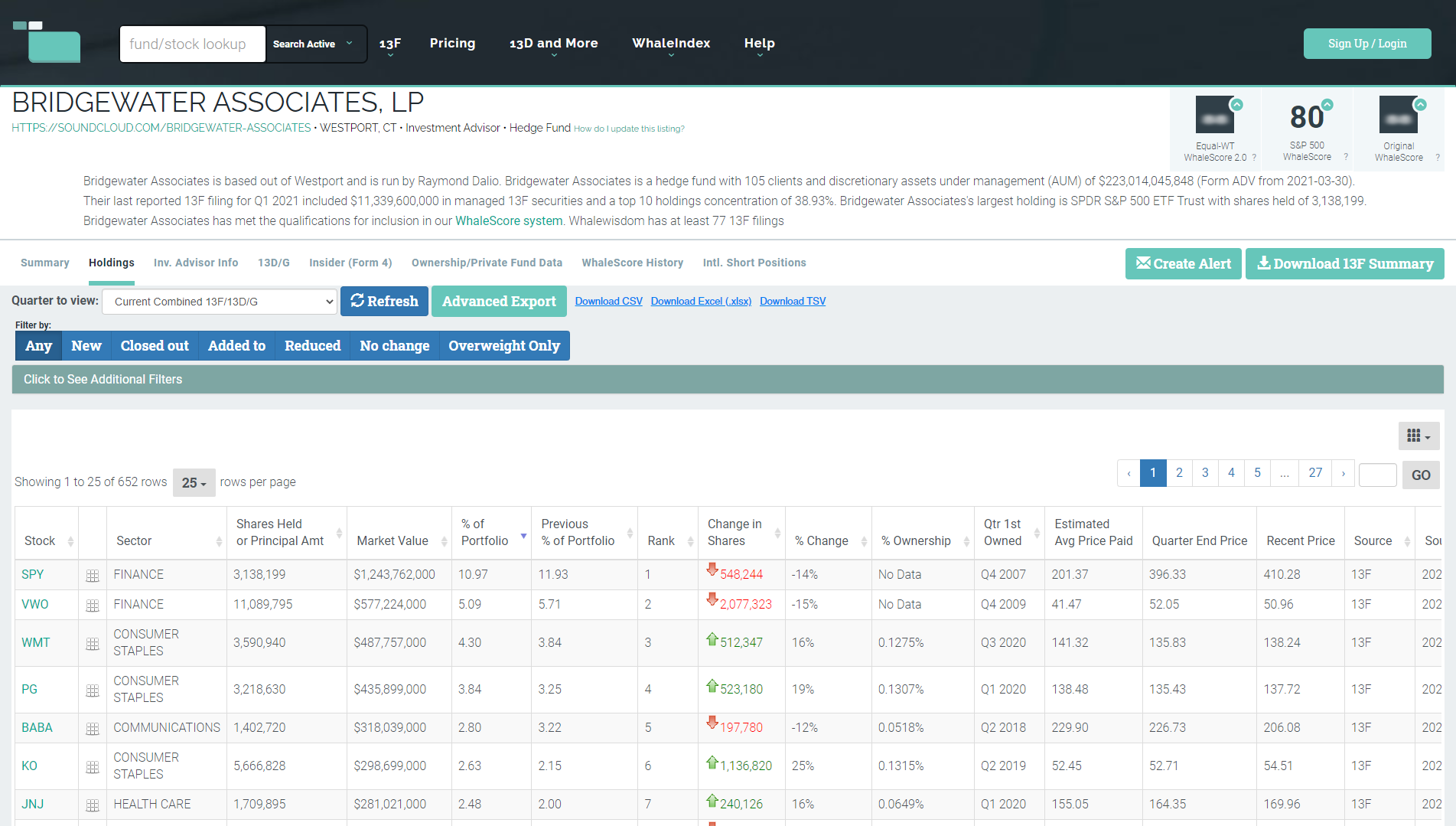 1) Распределение секторов с течением времени в Фонде Рэя Далио Bridgewater Associates и ТОП 20 Бумаг по весу на текущий момент