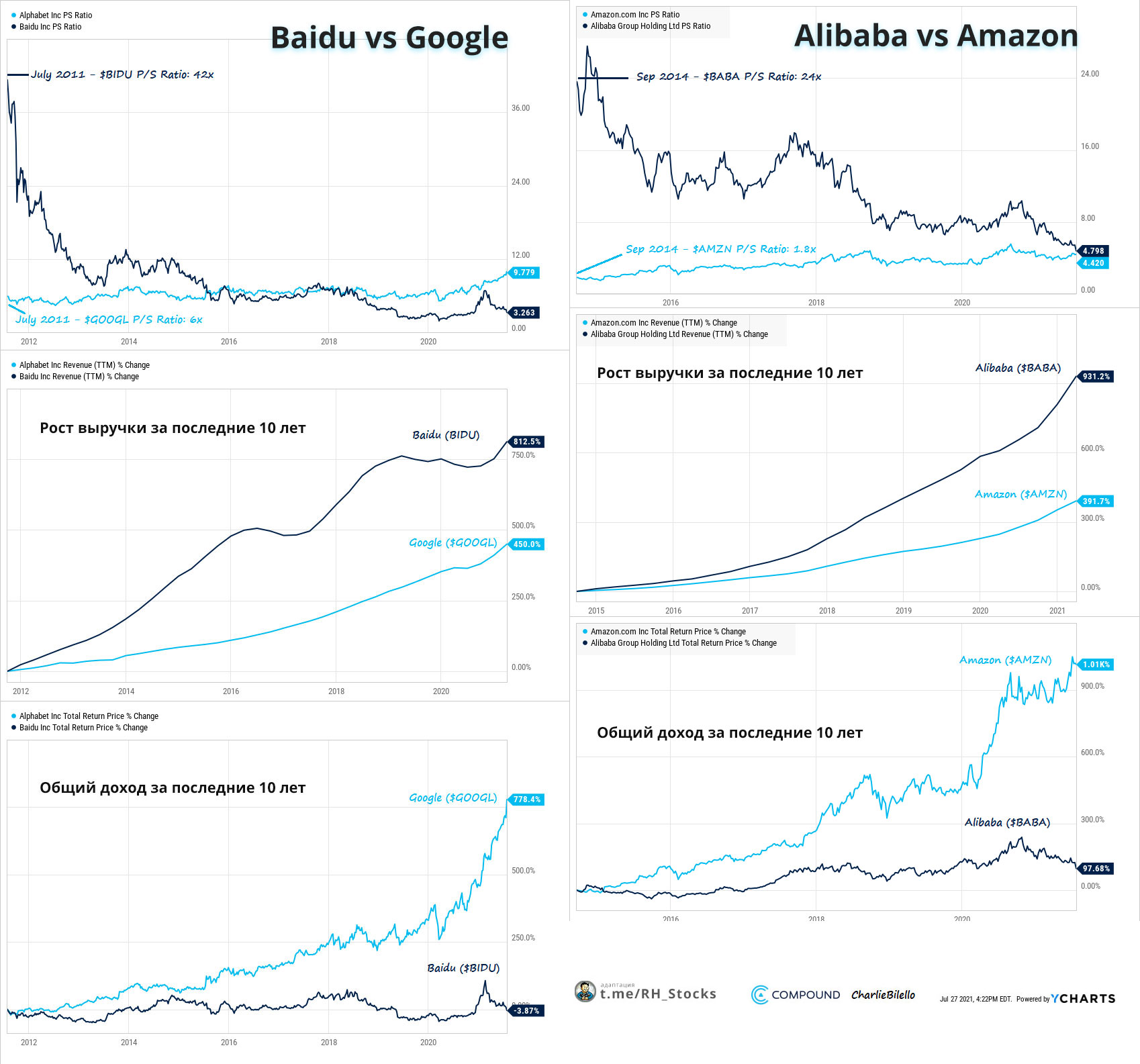 10 лет назад Baidu $BIDU (крупнейшая поисковая система в Китае) продавалась с P/S равным 42. Для сравнения: Google $GOOG (крупнейшая поисковая система в США) торговался с P/S 6, для сравнения широкий рынок S&P 500 торговался со средним значением P/S 1,2