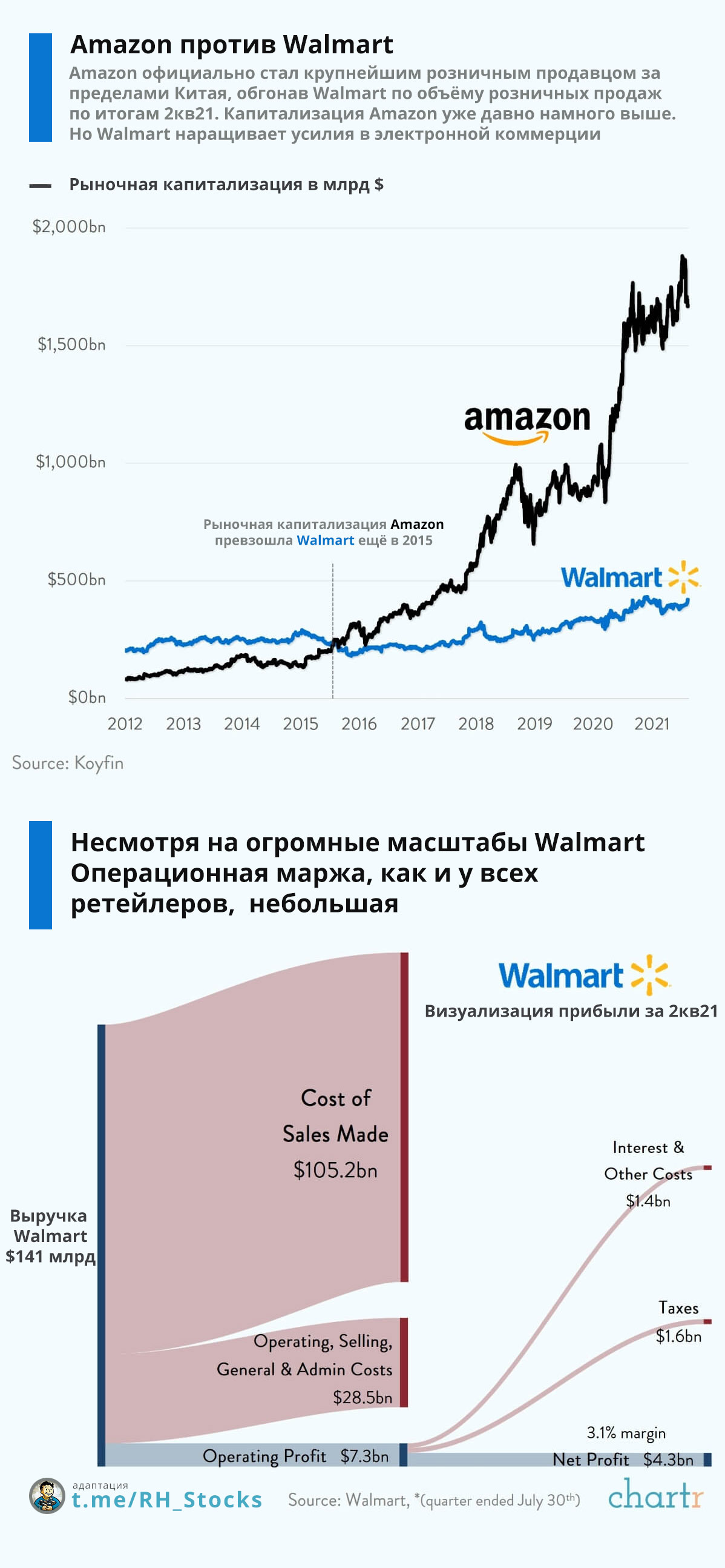 За 12 месяцев (Июнь 2020 — Июнь 2021), Amazon впервые обогнал Walmart $WMT по количеству розничных продаж