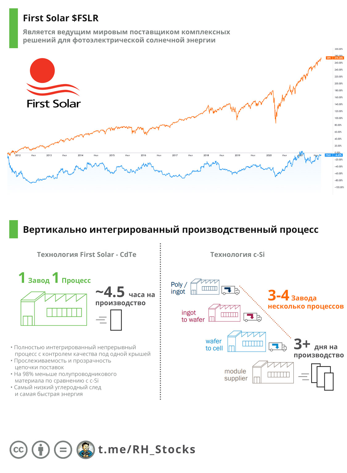Ещё одно преимущество First Solar заключается в том, что она не так сильно зависит от глобальной цепочки поставок как другие поставщики, так как имеет вертикально интегрированную цепочку поставок + она требует на 98% меньше полупроводников, чем технология c-Si