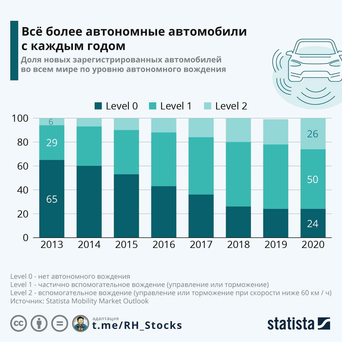 4️⃣ — Высокая автоматизация. Не требуют внимания водителя. Он может заснуть, покинуть водительское сидение. Waymo (Google $GOOG), Baidu $BIDU, Cruise (совместное предприятие GM $GM и Microsoft $MSFT) сейчас тут