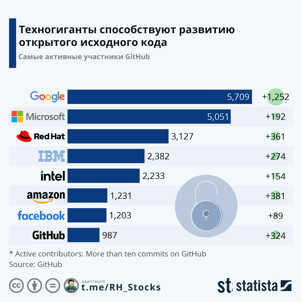 Техногиганты зарабатывают миллиарды на своём ПО, но они же одни из самых активных участников проектов с открытым исходным. Согласно «индексу открытого исходного кода OSCI» где коммерческие организации ранжируются по объему вкладов их сотрудников с открытым исходным кодом за год