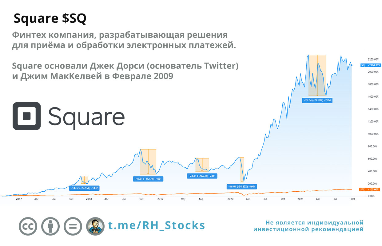 Square $SQ — Финтех компания, разрабатывающая решения для приёма и обработки электронных платежей. Square основали Джек Дорси (основатель Twitter $TWTR) и Джим МакКелвей в Феврале 2009