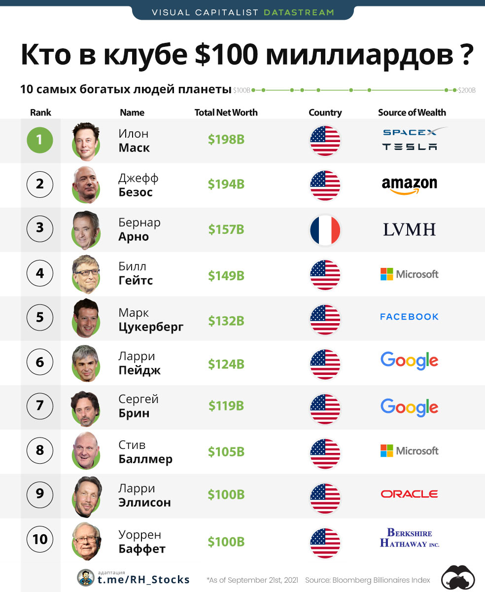Илон Маск (основатель Tesla $TSLA, Space X) в настоящее время является самым богатым из них, его состояние составляет $198 млрд. Учитывая стоимость акций Tesla. Многие ожидают, что пузырь Tesla в конечном итоге лопнет, подождём и посмотрим.