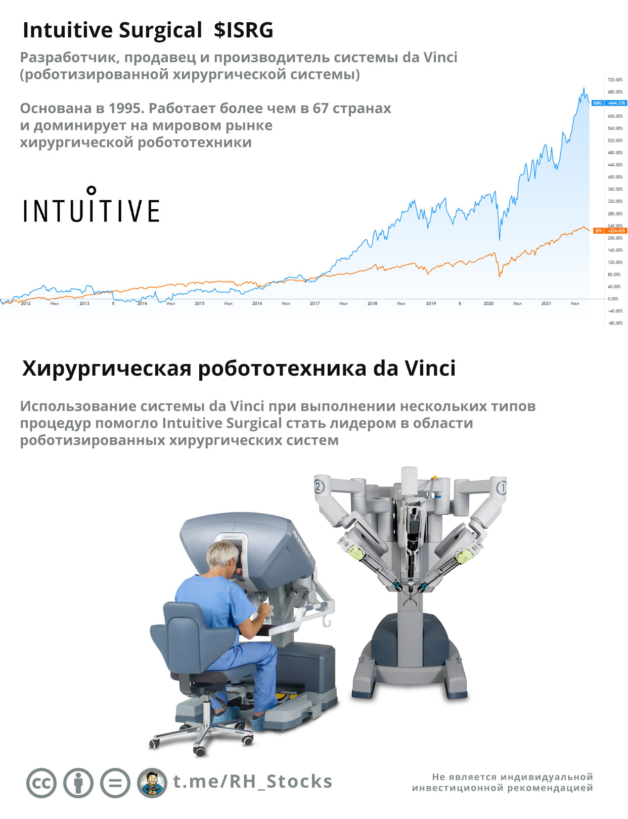 Intuitive Surgical $ISRG — разработчик, продавец и производитель системы da Vinci (роботизированной хирургической системы). Основана в 1995. Работает более чем в 67 странах и доминирует на мировом рынке хирургической робототехники. Конкурирует с такими компаниями как Medtronic $MDT, Stryker $SYK и Boston Scientific $BSX