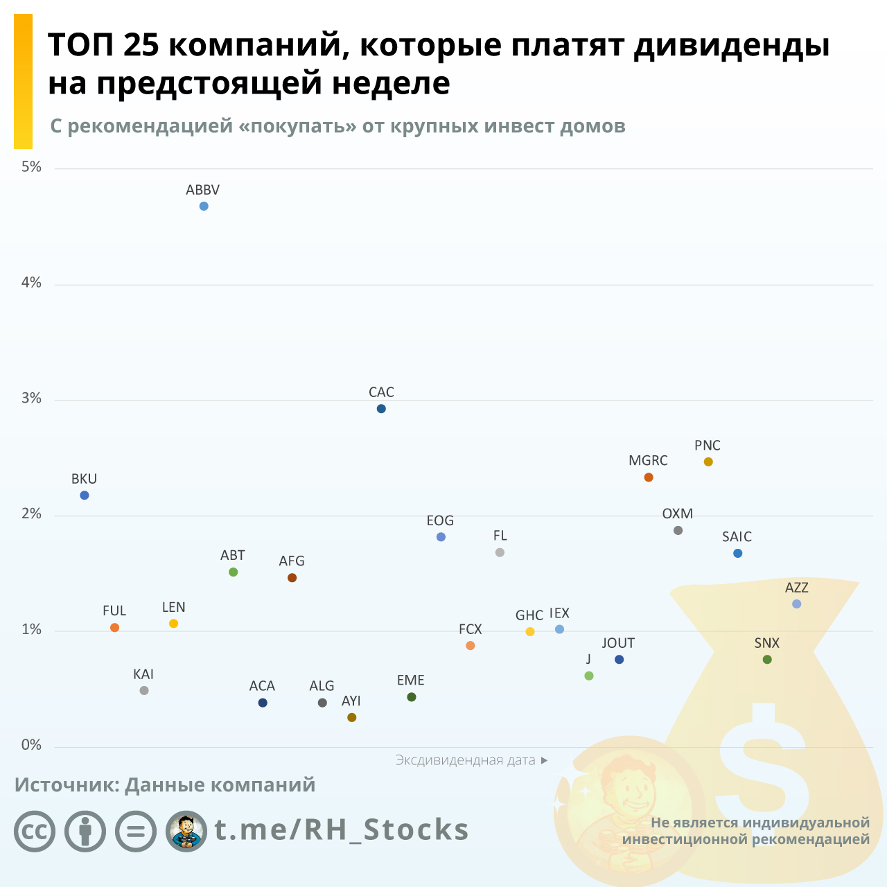 На Инфографике ТОП 25 компаний, у которых на предстоящей неделе Эксдивидендная дата (последний день покупки, дающий право на получение дивидендов) и по которым есть рекомендация «покупать» от крупных инвест домов