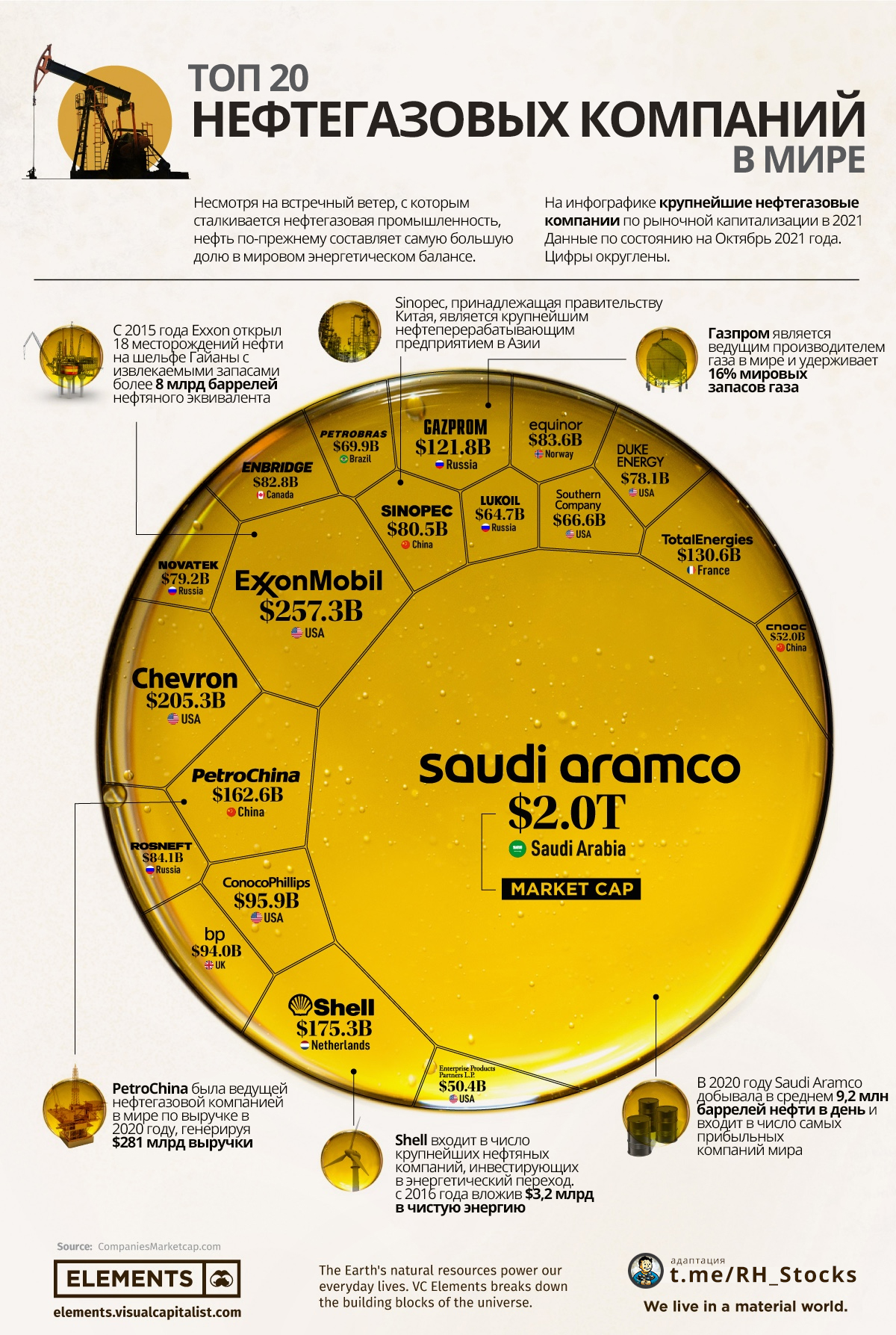 На инфографике рейтинг 20 крупнейших нефтегазовых компаний по рыночной капитализации которые существенно выигрывают от текущего состояния дел