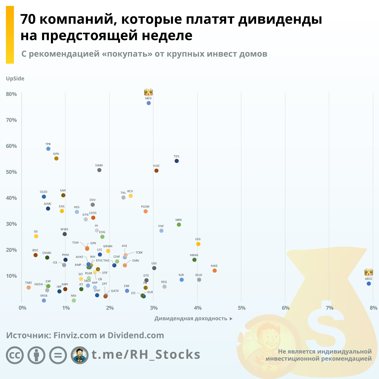 На Инфографике 70 компаний у которых на предстоящей неделе Эксдивидендная дата (последний день покупки, дающий право на получение дивидендов) и по которым есть рекомендация «покупать» от крупных инвест домов