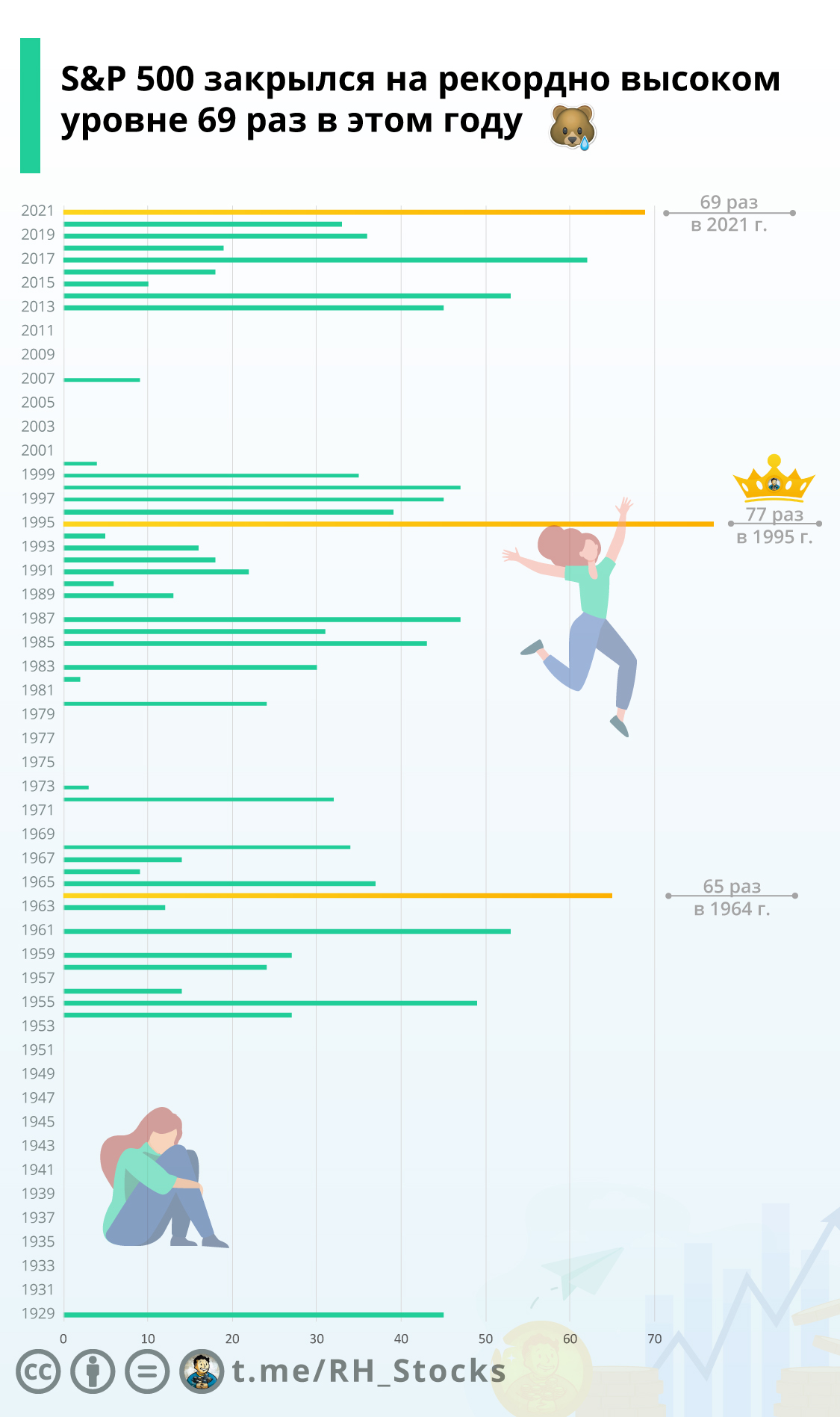Только в 1995 было больше рекордных максимумов за один календарный год, рекорд в 77 раз уже не перебить (до конца года осталось совсем немного), но ровно 70 или чуть больше ещё могут сделать 🧐