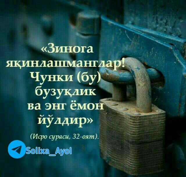 Нафснинг ҳоҳишларини кесинг, зеро банда ва Яратган ўртасидаги пардаларнинг биринчиси-бу Нафсдир! Зино эса Аллоҳ таоло наздида гуноҳи кабиралардан бири! Ҳамма аёл ўз ҳалоли билан баҳтли яшасин деб тилак қилиб қолувчи