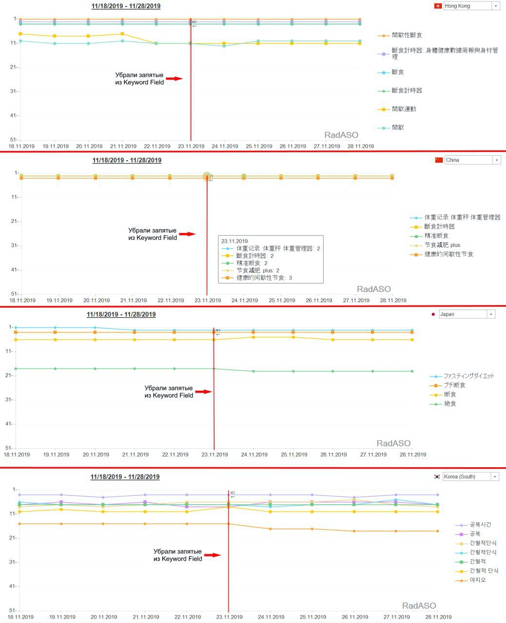 Ранее мы использовали запятые в поле ключевых слов, чтобы разделять поисковые запросы. Например (翻譯, 照片, 機, 韓文, 圖片...), а в новой итерации мы убрали все запятые и прописали запросы слитно (翻譯照片機韓文圖片...) во всех тестируемых локализациях.
