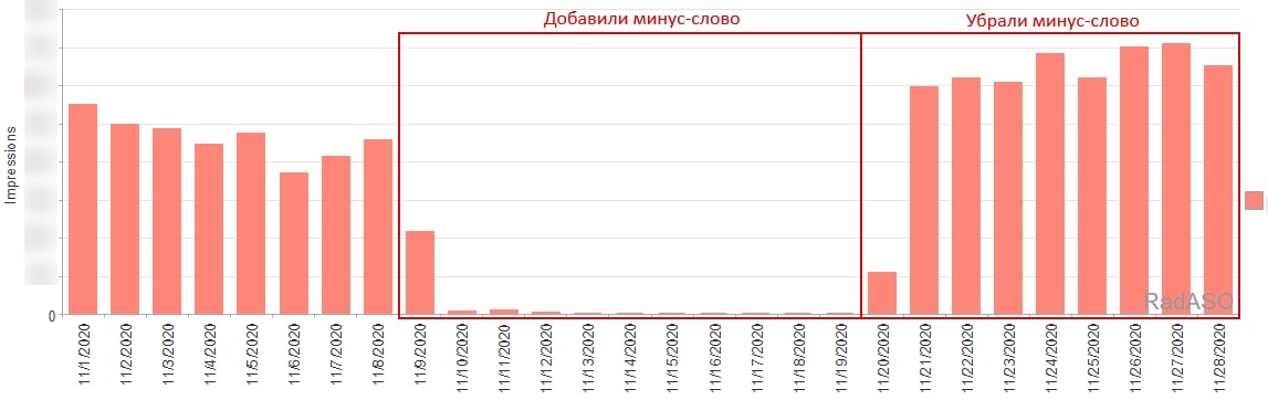 После того, когда мы решили удалить минус-слово «presets!!!» из адгруппы «presets» показы сразу вернулись