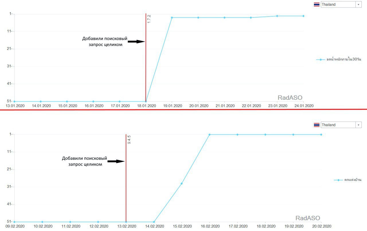 Но подготавливая метаданные мы заметили, что не ранжируемся по слитному написанию запроса (ลดน้ำหนักภายใน30วัน), а по раздельному приложение в выдаче есть (ลดน้ำหนักภายใน 30 วัน). Хотя все ключевые слова были прописаны в поле ключевых слов: ลดน้ำหนัก,ภายใน,30,วัน.