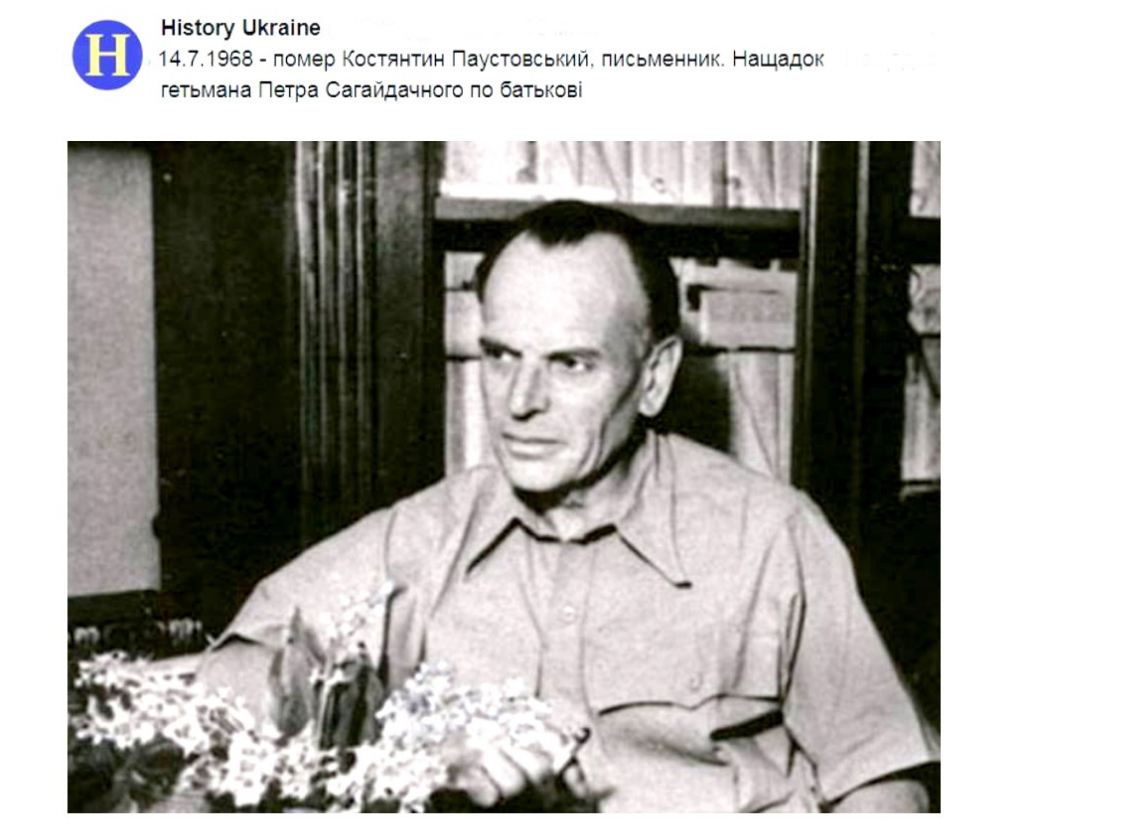 "Отец посмеивался над своим гетманским происхождением и любил говорить, что наши деды и прадеды были самыми обыкновенными хлеборобами". Паустовский - из ряда блестящих выпускников Первой киевской гимназии и Университета св Владимира. Хотя Константин Георгиевич родился в Москве. Назвать Паустовского украинцем мог только тот, кого описывал в 1917 году сам Паустовский.