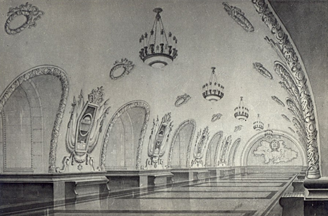 Вот проект станции метро Вокзальная в Киеве с художественным панно, изображающим Украинскую ССР. Без Крыма. Как это? А так, что Крым передали УССР в 1954 году. Но метро начали проектировать с 1936 года (помешала война), потом с 1945-го. Метро хотели открыть еще при жизни Сталина - в 1950 году. В это время Крым был частью РСФСР. Правда дело затянулось, как обычно. И данный эскиз скорее всего был создан в 1952 году. Первая очередь киевского метро была открыта только через восемь лет. В 1960-м.