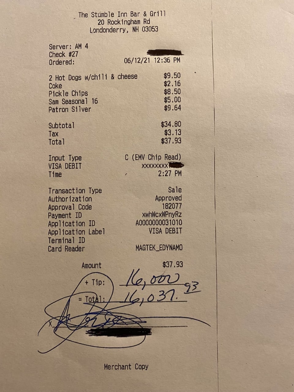 Этот чек с чаевыми в 16 тысяч долларов обрушил в соцсетях репутацию британского бара Stumbling Inn. История очень странная: в бар зашёл чувак, взял пиво и закусок на $37 (2700₽) и ушёл. Всё бы ничего, но чувак оказался щедрым на чай — оставил официантке $16 000 (больше миллиона рублей!). Бар же поделил деньги на всех. Их получили официанты, повара и другой персонал — всего 12 человек. Владелец не взял себе ни цента.