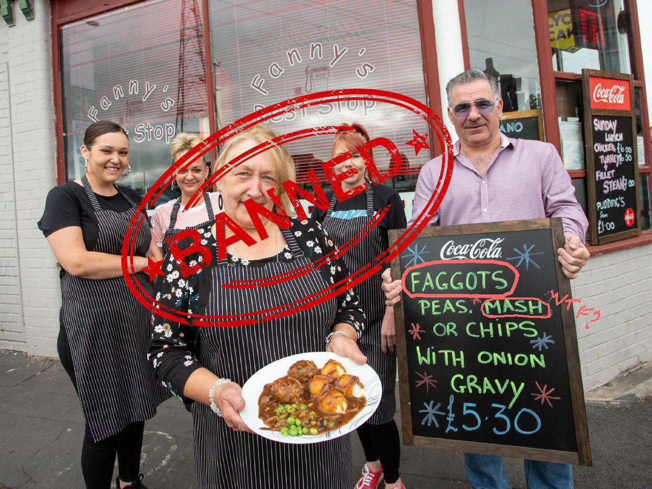 Тут всемогущий Google забанил рекламу семейного кафе. За традиционное британское блюдо faggots.