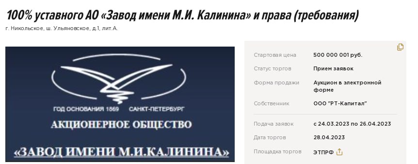 28 апреля 2023 года пройдут торги по продаже 100% уставного АО «Завод имени М.И. Калинина», который ведёт свою историю с 1869 года. Предприятие базируется в Ленобласти и по основному виду деятельности занимается (занималось точнее) производством оружия и боеприпасов (ОКВЭД).