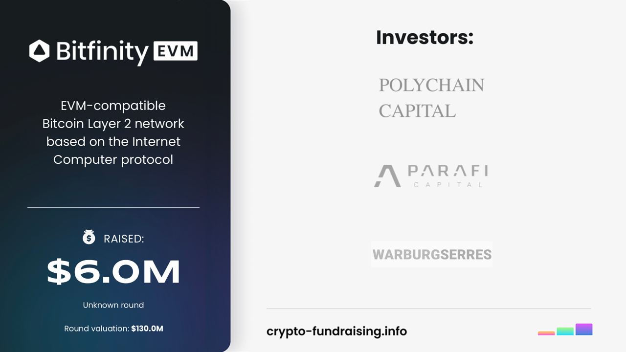 Bitfinity Network is EVM-compatible Bitcoin L2 network based on the Internet Computer protocol, Bitfinity raised $6M funding round from Polychain Capital, ParaFi Capital, Warburg Serres, Dokia Capital, Draft Ventures.