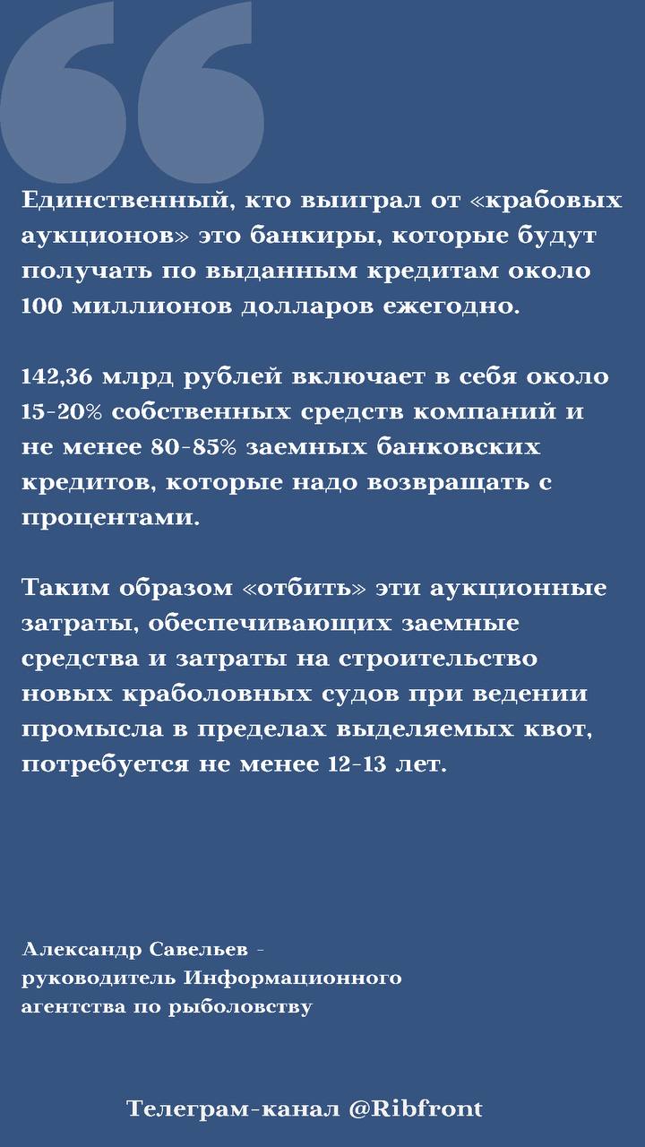 В-седьмых, единственный, кто выиграл от крабовых аукционов это банкиры, которые будут получать по выданным кредитам около 100 миллионов долларов ежегодно. 142,36 млрд рублей включает в себя около 15-20% собственных средств компаний и не менее 80-85% заемных банковских кредитов, которые надо возвращать с процентами. Таким образом «отбить» эти аукционные затраты, обеспечивающих заемные средства и затраты на строительство новых краболовных судов при ведении промысла в пределах выделяемых квот, потребуется не менее 12-13 лет.