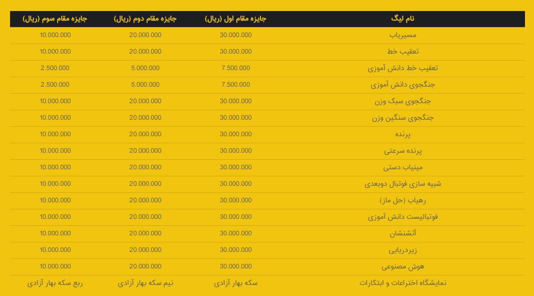 جوایز لیگ های دوازدهمین دوره مسابقات رباتیک RoboNIT به شرح جدول زیر می باشد.