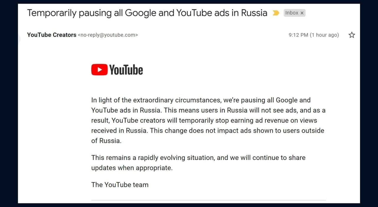 📹 Рассылка от YouTube: Google прекращает монетизировать рекламу в России!