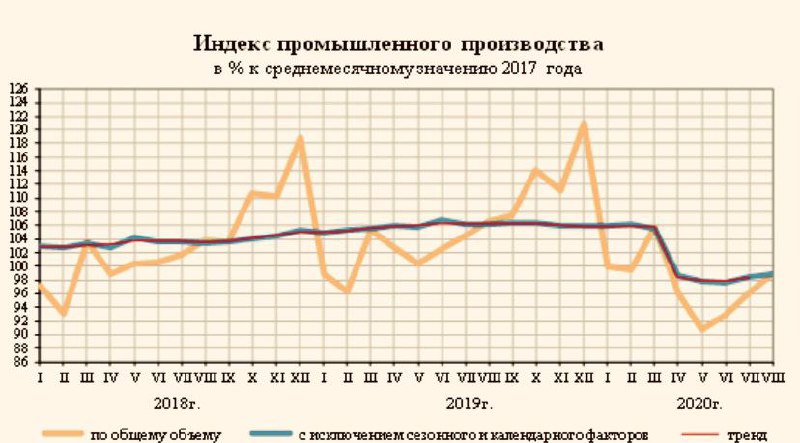 По данным Росстата, в августе 2020 года выпуск в промышленности сократился на 7,2% в годовом выражении вслед за падением на 8% в июле и на 9,4% в июне. Если в июне—июле замедление спада обеспечивали обрабатывающие отрасли, то в августе ситуация изменилась: в добыче темпы падения в августе замедлились до 11,8% с 15,1% в июле, а в обработке, наоборот, ускорились — до 4,1% в августе с 3,3% в июле.