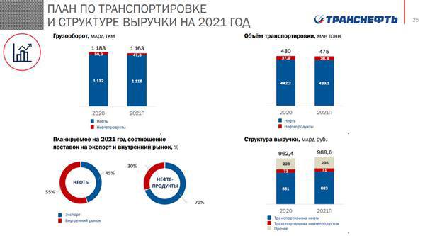 "Транснефть" планирует в 2021 году увеличить выручку на 2,7% - до 988,6 млрд рублей, следует из презентации компании. В том числе от транспортировки нефти ожидается доход в 683 млрд рублей, от транспортировки нефтепродуктов - 71 млрд рублей, прочее - 235 млрд рублей.