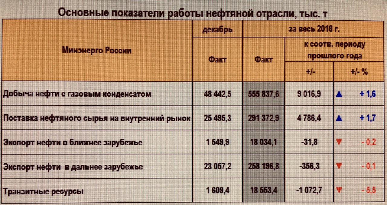 Добыча нефти и конденсата в 2018 г. составила 555,8 млн т, что на 9 млн.т (+1,6%) выше предыдущего года, свидетельствуют данные Министерства энергетики. При этом поставки сырья на внутренний рынок увеличились, а на экспорт снизились.