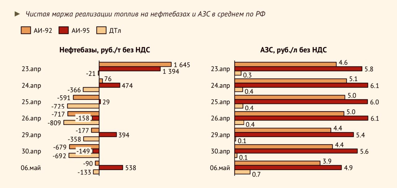 Средняя чистая маржа в розничном сегменте на неделе с 23 по 30 апреля сохранилась на том же уровне, который наблюдался в течение всего апреля: 4.8 руб./л для АИ-92 и 0.3 руб./л для ДТл.