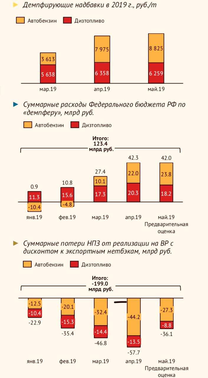 С учетом предварительных майских оценок за 5 первых месяцев 2019 г. производители моторных топлив получат из Федерального бюджета более 123 млрд руб. в качестве «демпфирующих» надбавок. Сумма выглядит впечатляющей. Однако эти выплаты лишь на 62% смогут компенсировать суммарные потери производителей от реализации автомобильного бензина и дизельного топлива с вынужденным дисконтом относительного экспортных нетбэков – с начала года они составили порядка 199 млрд руб. Результирующие потери НПЗ от поставок моторных топлив на внутренний рынок после получения «демпфера» – 75.6 млрд руб.