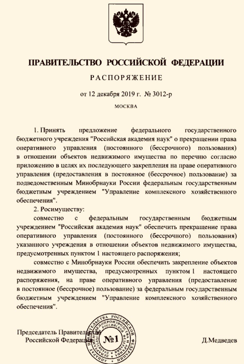 Правительство РФ лишило Российскую академию наук права оперативного управления зданием на улице Губкина, 3, в Москве. Распоряжение за подписью премьер-министра Дмитрия Медведева опубликовано на портале правовой информации (http://publication.pravo.gov.ru/Document/View/0001201912160016?index=0&rangeSize=1)