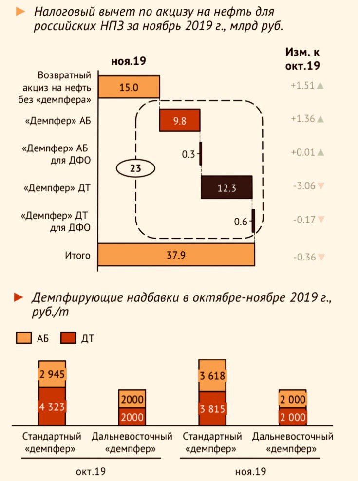 По предварительным оценкам, налоговый вычет по акцизу на нефть за ноябрь для российских НПЗ составил 37.9 млрд руб. Относительно октября ноя.19 выплаты из Федерального бюджета нефтепереработчикам сократились на 360 млн руб.