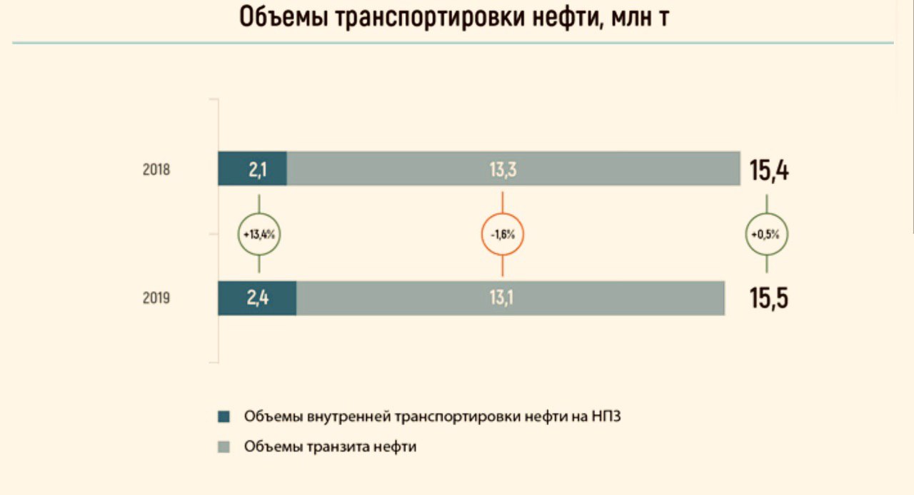 Укртранснафта” в 2019 году увеличило транспортировку нефти на 0,5% — с 15,44 млн тонн до 15,51 млн тонн. Объем внутренней транспортировки нефти на НПЗ в 2019 году составил 2,38 млн тонн — на 13,4% (281,3 тыс. тонн) больше, чем в 2018 году. Это самый высокий за последние пять лет объем прокачки нефти на НПЗ Украины. (http://www.naftogaz.com/www/3/nakwebru.nsf/0/FDE9D2FB70BB7319C225850700410352?OpenDocument&year=2020&month=02&nt=Новости&).