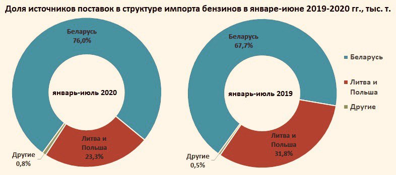 Основной прирост ресурса пришелся на май-июль. В мае импорт белорусских бензинов составил 66 тыс. т, в июне — 97 тыс. т, в июле — 92 тыс. т. Тогда как в предыдущее месяцы 2020 г. объем импорта из Беларуси колебался в пределах 45–50 тыс. т.