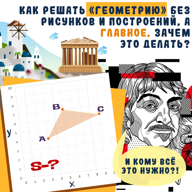 Спросите школьников, что им нравится больше: геометрия или алгебра? Почти каждый из них ответит – алгебра! Обычно это происходит потому, что она кажется намного проще геометрии.😫 Ведь большинство наших школьных задач в этом разделе математики в два счета сводятся к небольшому числу «стандартных» уравнений, а для остальных есть тысячи уже придуманных ранее алгоритмов решения, которые легко найдет Гугл или вообще самостоятельно оформит ChatGPT.😎 Не зря же существуют такие разделы алгебры как: комбинаторика, матричные вычисления… А вот в геометрии, наоборот, очень часто попадаются задачи, к которым не сыскать общих подходов и которые, напротив, требуют дополнительных построений, до которых еще придется додуматься самому!🤓