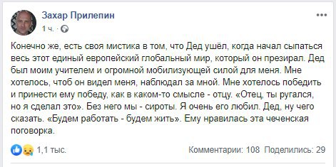 Но «толстолягий мордатый модный парень» принялся тиражировать версию «я ученик Лимонова». Вписал ему в «любимые» - чеченскую поговорку. Как будто не три дня назад фоткался в трусиках в инсту «дедушка не обижайся». Тьфу!